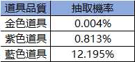 獎池中不同品質的道具,抽取時的機率不同,詳細如下:
