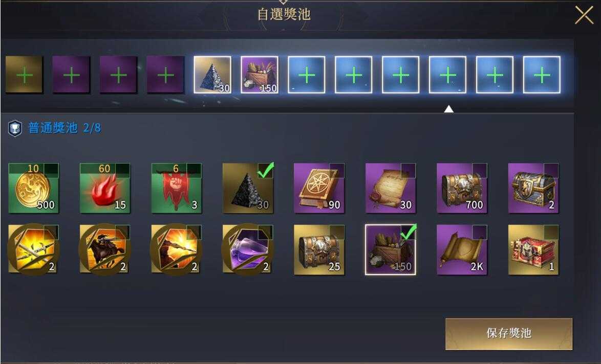 2、獎池中的道具分為金色、紫色、藍色3種品質,不同品質的道具可選擇的數量不同。